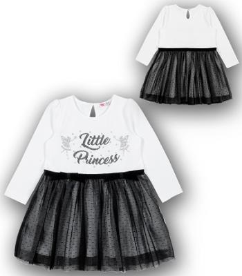 Платье прилегающего силуэта, с отрезной талией. Спереди блестящая шелкография цветным глитером. Горловина и капелька окантованы бейкой из основного полотна. Сзади застежка на пуговицу. На талии притачной пояс-резинка 1 см. Верх рукавов со сборкой. Верхний слой юбки из мягкой сетки, низ без обработки. Нижний слой из кулирки фуллайкры. Нижний слой короче верхних на 3 см.Дополнительно