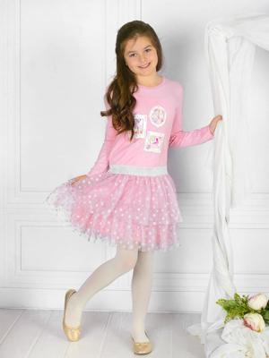 Нарядное платье из комбинированного полотна с длинным рукавом для девочки. Лиф платья выполнен из кулирки с лайкрой и украшен принтом "Фоторамки". Юбка отрезная с двумя многослойными воланами. Внутренний слой воланов выполнен из кулирки с лайкрой, второй слой - из гладкой сетки, а внешний слой воланов выполнен из сетки с набивкой в виде серебристых точек. Серебристый пояс на резинке.Дополнительно