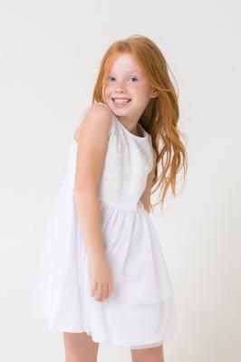 Платье из хлопкового трикотажа супрем, отрезная юбка на сборке. Верхние слой юбки из сетки с открытыми срезами. Спереди на полочке принт. Застежка по спинке на кнопки-ободок.Дополнительно