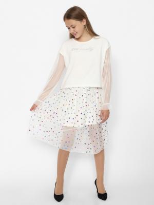 Нарядная двухслойная юбка для девочки из сетки с блестящими кружочками "конфетти". Эластичный пояс с люрексом. Подкладка выполнена из хлопкового трикотажа. Подкладка короче верхнего слоя сетки.Дополнительно