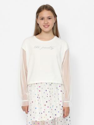 Нарядный укороченный джемпер, свободного кроя, с длинным рукавом из кулирки с эластаном. Рукава из легкой и мягкой сетки, со сборкой внизу и спущенными плечами. Спереди блестящая шелкография.Дополнительно