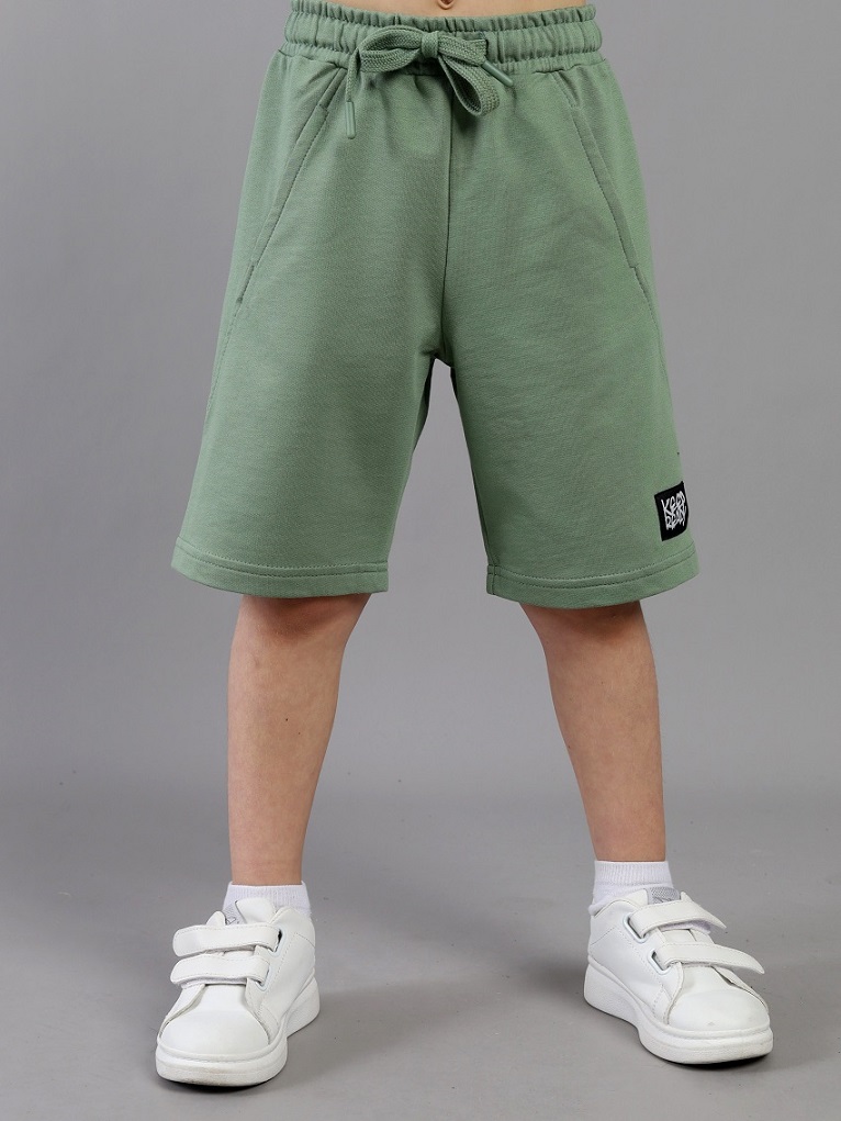 Шорты для мальчика футера. Верх шорт обработан притачным поясом из основного полотна и эластичной резинкой внутри, в пояс вттавлен функциональный шнурок с пластиковым наконечником. Боковые швы с наклоном и карманами. В нижней части расположен вязаная нашивка.Дополнительно
