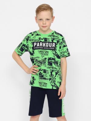 Шорты для мальчика из кулирной глади повышенной плотности. Верх шорт обработан притачным поясом из полотна с добавлениемм эластана, в пояс вставлена резинка и функциональный шнур с декоративной вязаной нашивкой. Шорты с боковыми разрезными вставками. Нижняя боковая часть вставки декорирована принтом "Легенда".Дополнительно