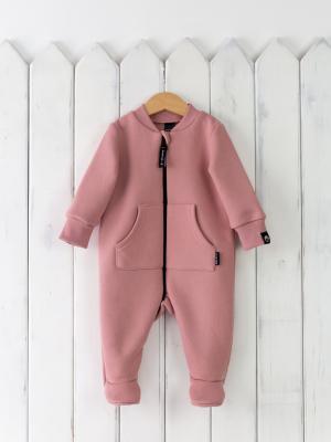 Теплый комбинезон на молнии, с карманом-кенгуру. Выполнен из футера 3-нитки с начесом (80% хлопок, 20% полиэстер), манжеты и воротник их кашкорсе, 95% хлопок, 5% эластан. Размеры 62 и 68 с закрытой стопой, 74-86 на манжете.Дополнительно