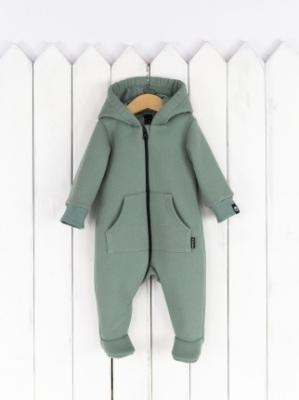 Теплый комбинезон из однотонного футера 3-нитки с начесом (80% хлопок, 20% п/э). Капюшон на подкладке из кулирки, 100% хлопок, по переду модный карман «кенгуру». Современное звучание комбинезону придают черная молния с брендированным навесом и черные жаккардовые этикетки на кармане и манжете. Размеры 62 — 74 с закрытой стопой, 80 и 86 — на манжете.Дополнительно