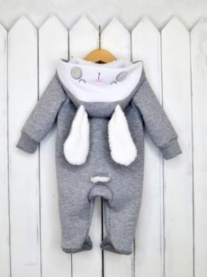 Серый теплый комбинезон "Заяц" от Baby Boom выполнен из футера 3-х нитки с начесом. По центру застегивается на молнию. Капюшон с пушистыми ушками, пушистыми вставками из велсофта и вышивкой в виде мордочки зайки. Сзади милый пушистый хвостик.Дополнительно