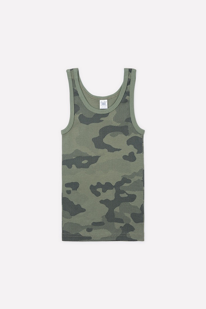 Хлопковая камуфляжная майка для мальчика. Горловина и проймы обработаны тёмно-оливковой бейкой.Дополнительно
