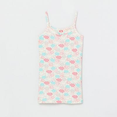 Набивная майка на бретелях из окантовки. Верхние срезы спинки и переда обработаны окантовкой из основного полотна. Посередине горловины переда пришит атласный бантик отделочного цвета.Дополнительно