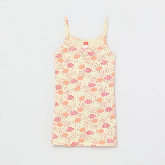 Набивная майка на бретелях из окантовки. Верхние срезы спинки и переда обработаны окантовкой из основного полотна. Посередине горловины переда пришит атласный бантик отделочного цвета.Дополнительно