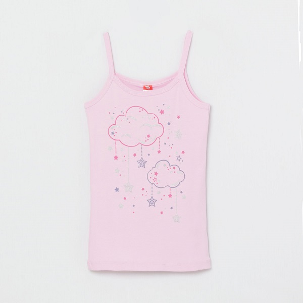 Гладкокрашеная майка на бретелях из окантовки. Верхние срезы спинки и переда обработаны окантовкой из основного полотна. Перед оформлен шелкографией.Дополнительно