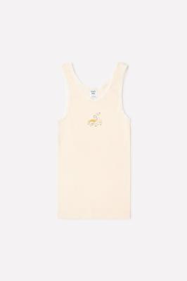 Майка на лямках из натурального хлопка. Сшита из эластичного материала рибана пенье. Горловина и проймы обработаны резинкой. Украшена принтом.Дополнительно
