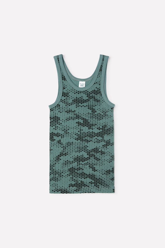 Майка на лямках из натурального хлопка. Сшита из эластичного материала рибана пенье. Украшена набивным рисунком. Горловина и проймы обработаны бейкой.Дополнительно