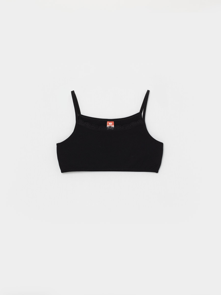 Бюстье для девочки на бретелях из окантовочной резины. Верхний срез переда обработан эластичной ажурной резинкой шириной 15 мм, все остальные срезы обработаны эластичной резиной со сгибом в цвет полотна.Дополнительно