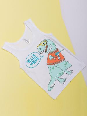 Майка для мальчика белая с принтом в виде динозавра трикотажная из супрема пенье. Майка из хлопка, прямого кроя, на широких лямках идеально садится по фигуре, мягко облегает, хорошо тянется и держит форму. Модель удобная в носке, а также стильная и эффектная.Дополнительно
