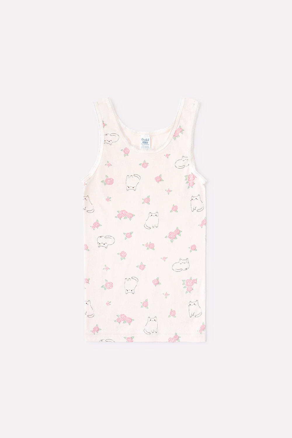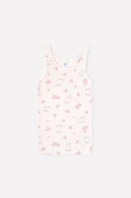 Майка на лямках из натурального хлопка. Сшита из эластичного материала рибана пенье. Украшена набивным рисунком.Дополнительно