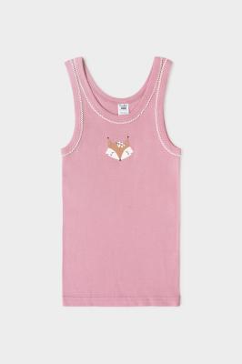 Майка на лямках из натурального хлопка. Сшита из эластичного материала рибана пенье. Украшена набивным рисунком.Дополнительно