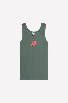 Майка для мальчика из натурального хлопка. Сшита из эластичного материала рибана пенье. Украшена принтом с изображением машинки. Горловина и проймы обработаны бейкой.Дополнительно