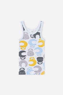 Майка для мальчика из натурального хлопка. Сшита из эластичного материала рибана пенье. Украшена набивным рисунком с изображением ленивцев. Горловина и проймы обработаны бейкой и кантом.Дополнительно