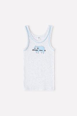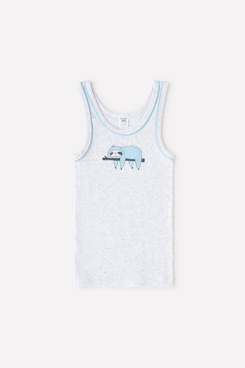 Майка для мальчика из натурального хлопка. Сшита из эластичного материала рибана пенье. Украшена принтом с изображением ленивца. Горловина и проймы обработаны бейкой и кантом.Дополнительно