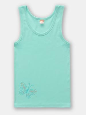 Гладкокрашенная майка с плечом. Горловина и проймы обработаны окантовкой из основного полотна. Перед оформлен небольшой шелкографией с использованием блестящей краски.Дополнительно