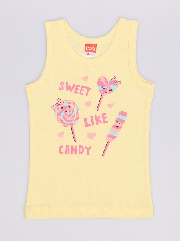 Гладкокрашенная майка с плечом. Горловина и проймы обработаны окантовкой из основного полотна. Перед оформлен шелкографией.Дополнительно