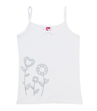 Майка для девочки, гладкокрашенная из хлопкового трикотажа с эластаном. Срезы майки и бретели обработаны матовой эластичной резиной со сгибом. Шелкография выполнена глитером (краска с блеском).Дополнительно