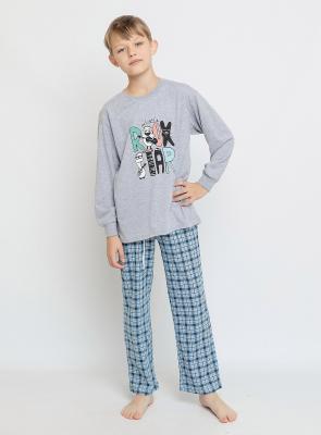 Пижама для мальчика трикотажная из супрема: футболка с длинным рукавом и брюки. Детская пижама сшита из 100% натурального гипоаллергенного хлопка. Пижама подойдет для сна дома и в детском саду, а также можно носить как домашний костюм. Футболка серая с принтом в виде надписей и прямые брюки в клетку на завязках.Дополнительно