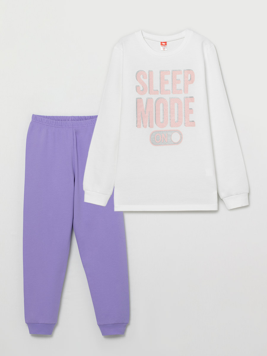 Джемпер с длинными рукавами и принтом спереди. Рукава с манжетами из эластичного полотна по низу. Горловина круглая, обработана притачным воротником из полотна с эластаном. с манжетами по низу. На талии брюки собраны на резинку.Дополнительно