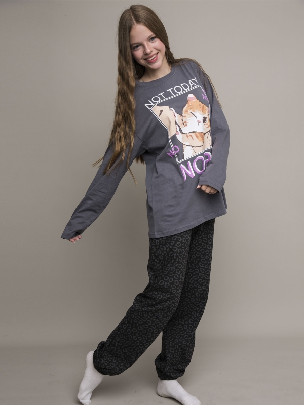Детский пижамный комплект для девочки из супрема пенье. Футболка серая с длинным рукавом и милым принтом в виде котика и надписями. Брюки черные со стильным леопардовым принтом. Эластичная резинка на брюках для комфортного сна.Дополнительно