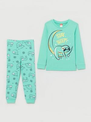 Джемпер с длинными рукавами и круглой горловиной. Рукава втачные, с манжетами из эластичного полотна по низу. Горловина обработана воротником из эластичного полотна. Спереди джемпер декорирован принтом. Брюки прямые, с манжетами из эластичного полотна по низу. На талии брюки собраны на резинку. Брюки выполнены из полотна с набивкой.Дополнительно