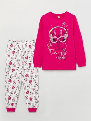 Джемпер с длинными рукавами и принтом спереди. Рукава с манжетами из эластичного полотна по низу. Горловина круглая, обработана притачным воротником из полотна с эластаном. Брюки из набивного полотна с манжетами по низу. На талии брюки собраны на резинку.Дополнительно