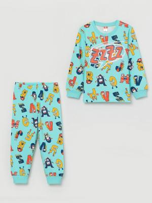 Джемпер из набивного полотна с длинными рукавами. Рукава втачные, с манжетами по низу. Горловина круглая, обработана воротником из полотна с эластаном. Брюки из набивного полотна с манжетами. По талии брюки собраны на резинку. Джемпер декорирован принтом.Дополнительно