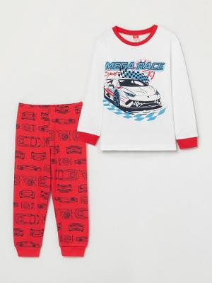 Джемпер для мальчика с длинными рукавами. Рукава втачные, с манжетами по низу. Горловина круглая, обработана воротником из полотна с эластаном. Брюки из набивного полотна с манжетами. По талии брюки собраны на резинку. Джемпер декорирован принтом.Дополнительно