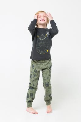 Хлопковая пижама для мальчика. Чёрный джемпер с изображением рогатого монстрика и брюки оливкого цвета с набивным принтом "Кемпинг". На рукавах и брючинах - мягкие трикотажные манжеты.Дополнительно