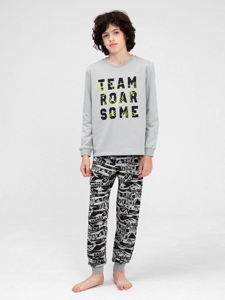 Пижама для мальчика из джемпера и брюк. Джемпер с круглой горловиной и длинными рукавами с манжетами из материала с добавлением эластана. Брюки без карманов из набивного хлопка, пояс цельнокроенный с эластичной резинкой внутри. Низ брюк с притачными манжетами из полотна с добавлением эластана. Перед декорирован принтом "Team roar some" Командный рев.Дополнительно