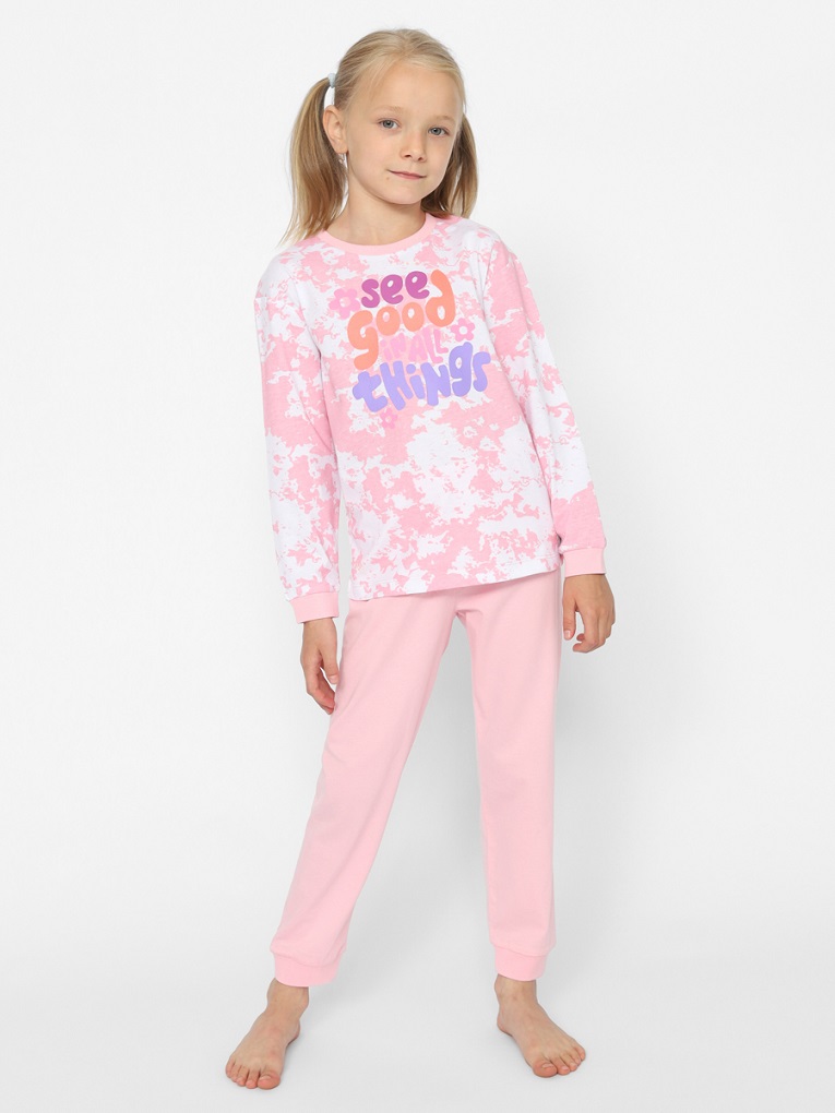 Натуральная стильная хлопковая пижама. Пижамный костюм пошит в свободном полуприлегающем стиле, без карманов, для полного комфорта во сне. Комплект подойдет как ночная пижама для сна и как домашний милый костюмчик. Джемпер из набивного полотна с длинными рукавами и эластичными манжетами. Перед декорирован принтом (надпись: Видеть хорошее во всех вещах). Пижамные штаны на эластичной, удобной резинке. Манжеты придают дополнительное удобство при носке пижамки.Дополнительно