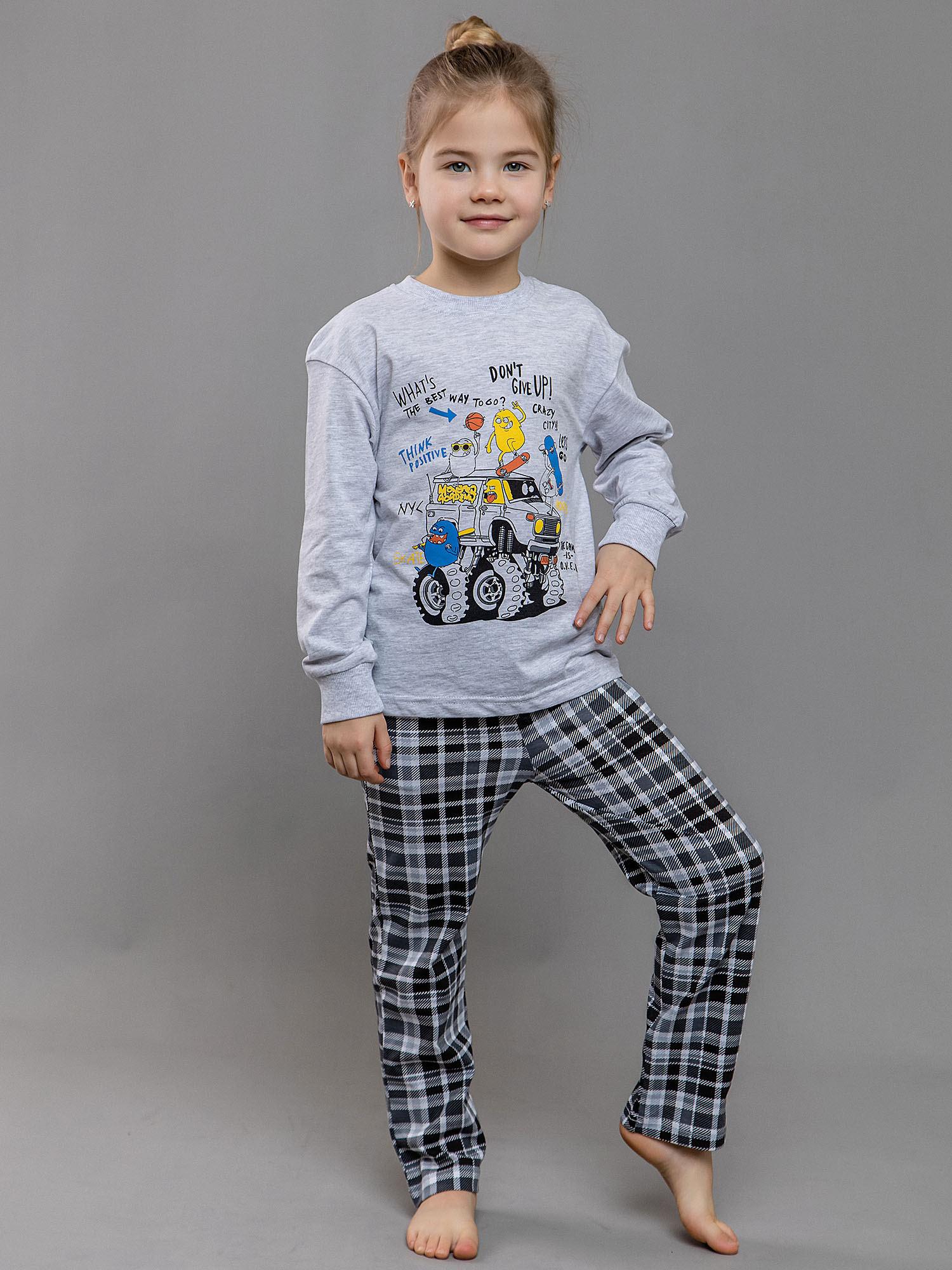 Комплект детский трикотажный: футболка с длинным рукавом и брюки. Домашний костюм подойдет как девочке, так и мальчику. Выполнен из мягкого хлопкового материала - супрем пенье. Футболка серая с длинным рукавом и принтом на груди. Брюки с принтом в клетку.Дополнительно