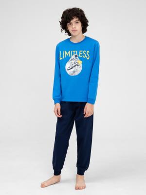 Пижама для мальчика из джемпера и брюк. Джемпер с круглой горловиной и длинными рукавами с манжетами из полотна с добавлением эластана. Брюки без карманов, пояс цельнокроеный с эластичной резинкой внутри. Низ брюк с притачными манжетами из полотна с добавлением эластана. Перед декорирован принтом "Limitless" Безграничный.Дополнительно