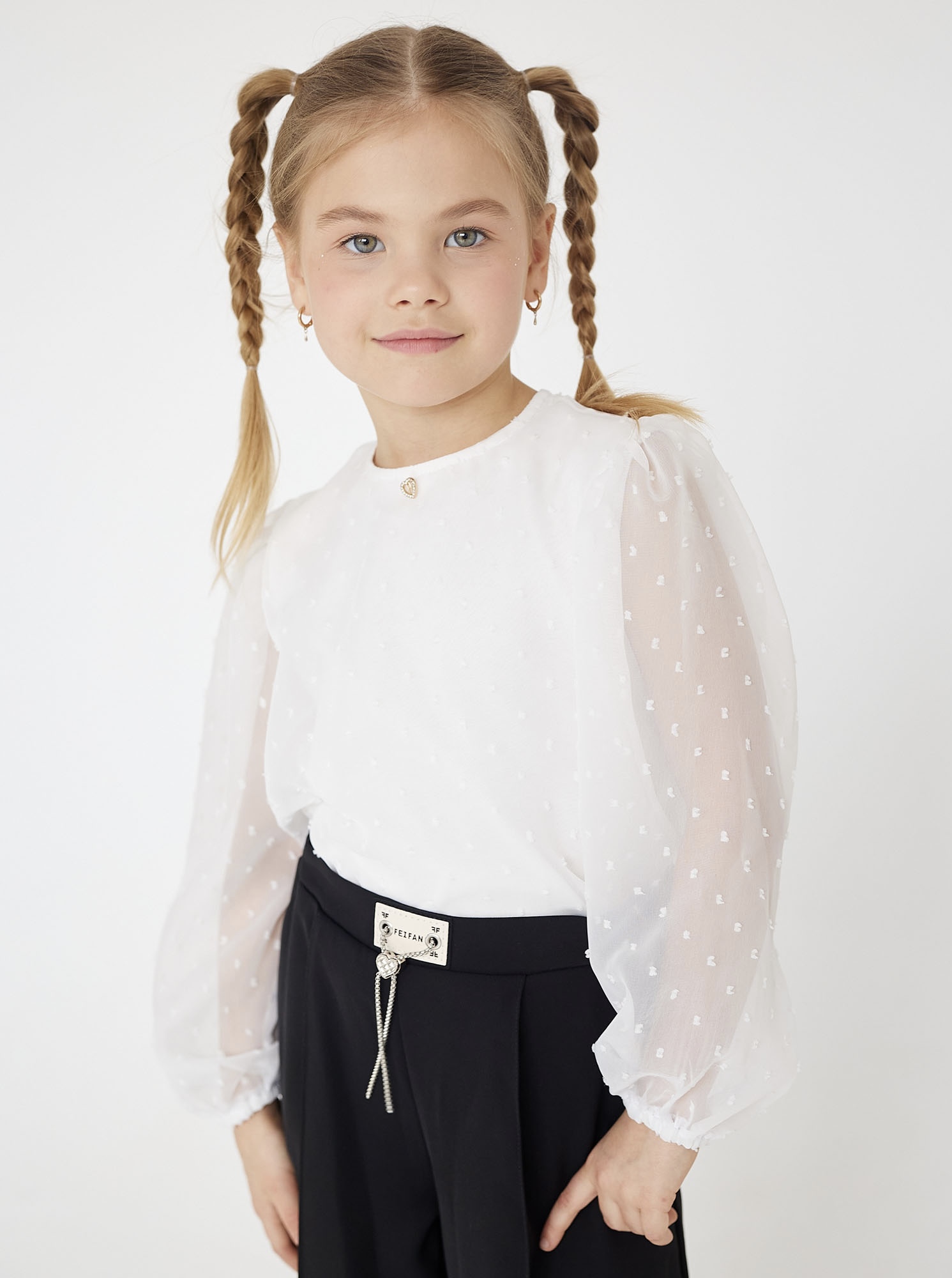 Блузка для девочки прямого силуэта с объемными длинными рукавами и съемной цепочкой идеально подходит для школы. Основа блузки выполнена из хлопкового трикотажа, а рукава из тонкого шифона. Длинные рукава блузки у запястий прихвачены резинкой. По спинке блузка застегивается на пуговицу.Дополнительно