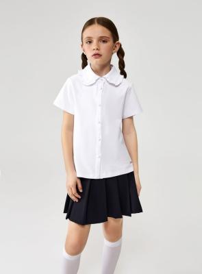 Школьная блузка с коротким рукавом для девочки - идеальный выбор для тёплых дней. Модель свободного силуэта обеспечивает комфортную посадку для разных типов фигуры. Застежка на пуговицы в виде жемчужинок придает модели нежный акцент. Несъёмный отложной воротник украшен по краю рюшью, что делает внешний вид изделия ещё более утончённым и подчёркивающим милую девичью натуру. Спереди по низу изделия расположена декоративная металлическая нашивка с названием бренда. Стилизуйте блузку в школьных образах с юбкой-плиссе (20240180069) и белыми гольфами, чтобы создать простой и модный аутфит. Также модель может стать частью школьной формы.Дополнительно