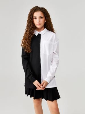 Детская блузка прямого силуэта для девочек из школьной коллекции выполнена из черной и белой хлопковой ткани, обладающей высокой гигроскопичностью и воздухопроницаемостью. Модель оверсайз с длинными рукавами и застёжкой на пуговицы и петли обеспечивает комфорт и удобство в повседневном ношении.Стояче-отложной несъёмный воротник добавляет блузке изысканность. На передней части белой ткани расположен накладной карман. Кокетка с центральной складкой и разрезы по низу изделия подчёркивают нежность и лёгкость.Манжеты с застёжкой на пуговицу добавляют удобства. Стилизуйте блузку с юбкой для создания простого и стильного школьного образа. Блузка станет незаменимым элементом гардероба вашей дочери, выражая её индивидуальность и стиль. Рост модели на фото 158. Размер модели на фото 164.Дополнительно