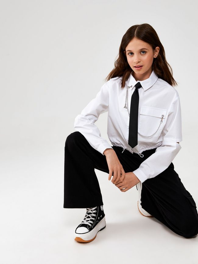 Внимание: галстук не входит в комплект и является примером стилизации. Объемная укороченная блузка в стиле k-pop для девочки. Трендовая модель с кулиской по низу изделия и длинными рукавами с декоративными разрезами на них - стильный способ встретить новый сезон. Блузка выполнена из качественной и дышащей хлопковой ткани. Чуть приспущенная линия плеча и объёмный крой позволяют легко двигаться. По центру расположена застежка на пуговицы и петли, позволяющая легко и быстро одеваться. Стояче-отложной воротник добавляет изделию завершенный вид и нотки деловой строгости. На груди расположен накладной карман с клапаном. Кончик воротника и клапан кармана соединяет съёмная металлическая декоративная цепочка на карабинах, придающая модели стильный акцент; цепочка дополнена подвеской в виде логотипа бренда. Низ изделия по желанию утягивается шнурком со стопперами. Ультрамодная блузка придется по вкусу всем любительницам корейской культуры, а комфорт в ношении сделает её любимой частью гардероба. Добавьте к блузке брюкДополнительно