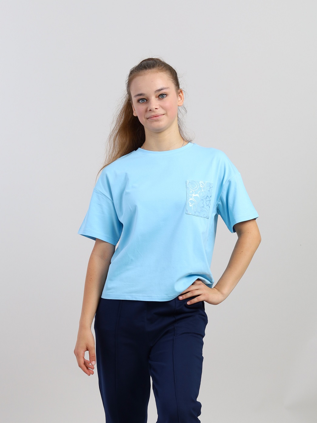 Джемпер для девочки с короткими рукавами, свободного силуэта, спущенным плечом и воротником из основного полотна. Спереди декорирован двухслойным карманом из сетки с рисунком и основного полотна.Дополнительно