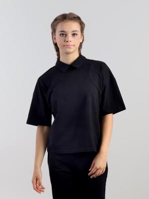 Джемпер для девочки с короткими рукавами свободного силуэта, спущенным плечом и отложным воротником. Сзади застежка на пуговицу. Спереди декорирован металлическим лейблом.Дополнительно