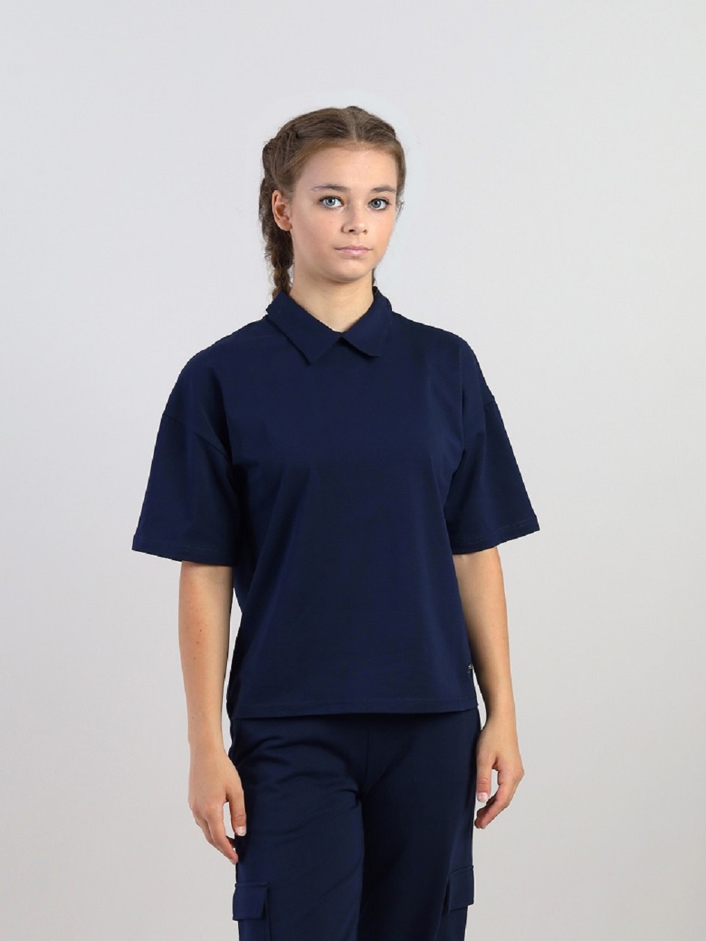 Джемпер для девочки с короткими рукавами свободного силуэта, спущенным плечом и отложным воротником. Сзади застежка на пуговицу. Спереди декорирован металлическим лейблом.Дополнительно