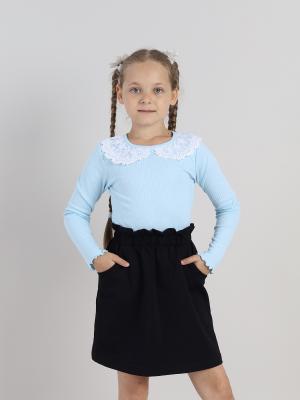Джемпер для девочки из интерлока с разборой (лапша), с длинными рукавами и отложным кружевным воротником. Сзади застежка на пуговицу. Низ изделия и нижние срезы рукавов обработаны строчкой, создающей эффект рюшек по краю изделия.Дополнительно