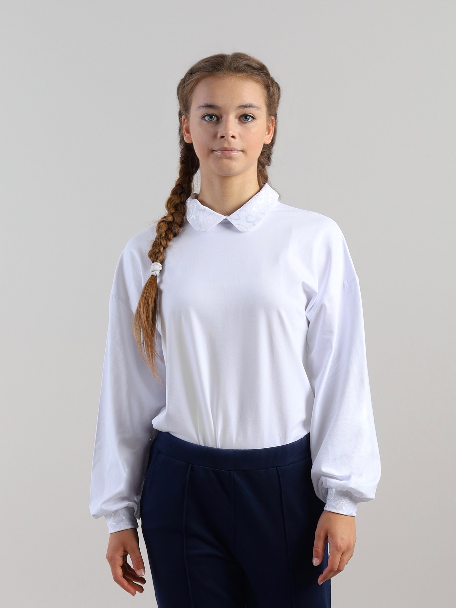 Джемпер для девочки с длинными рукавами и отложным двойным воротником из сетки и кулирки, свободного силуэта. Рукава объемные, со спущенным плечом, снизу манжет - верхний слой из сетки и нижний из кулирки. Спинка с вырезом-капелькой и застёжкой на пуговицу-бусину с петлёй.Дополнительно
