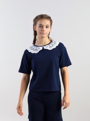 Джемпер для девочки свободного силуэта с короткими рукавами. Горловина круглая, оформлена декоративным воротником из кружева. В верхней части спинки обработана застежка "капелька" на пуговицу.Дополнительно