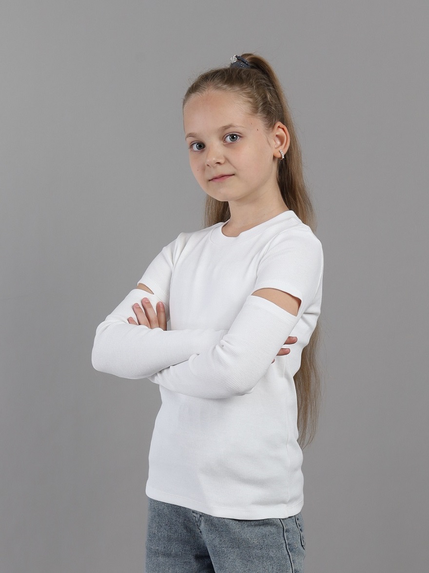 Джемпер для девочки из кашкорсе с разрезами на рукавах. Воротник из основного полотна.Дополнительно