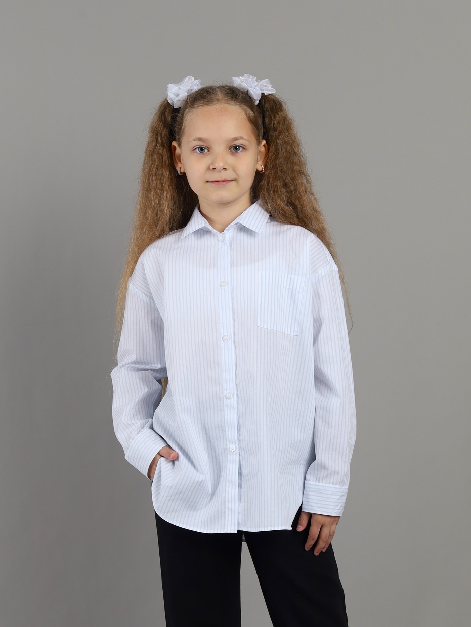 Удлиненная оверсайз блузка из хлопка в изящную полоску, свободного силуэта с отложным воротником и длинными рукавами. Застёжка центральная на планку с пуговицами. Спереди карман. Низ закругленный.Дополнительно